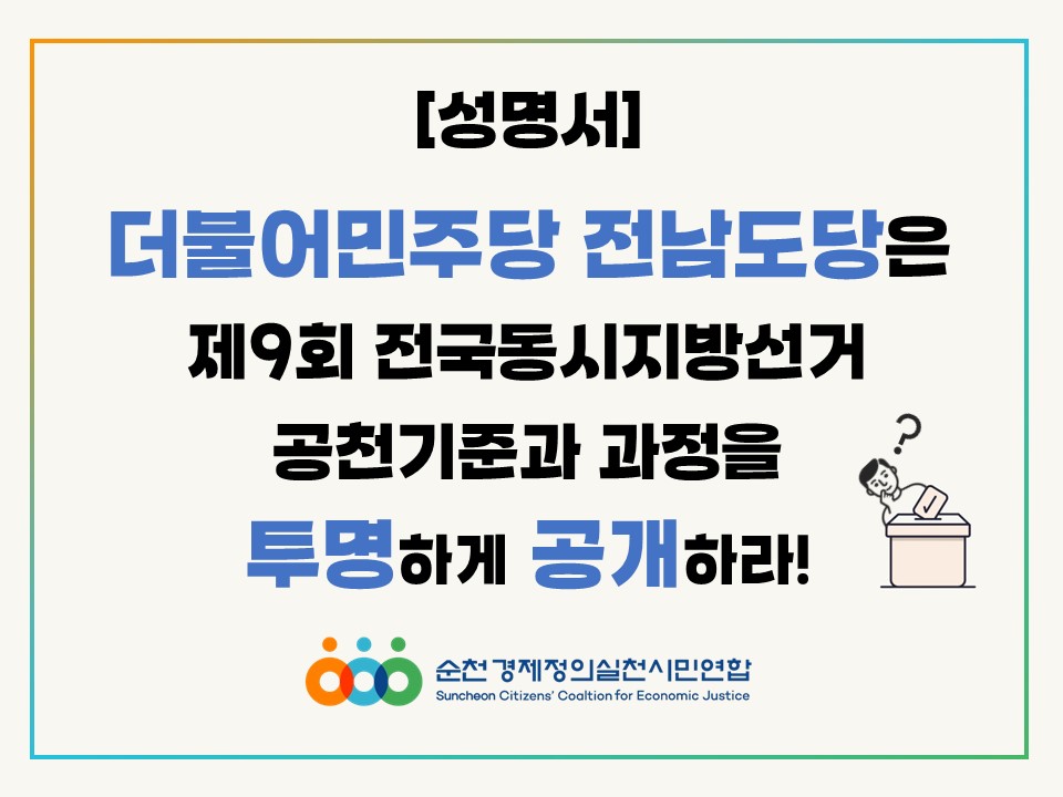 Áö³ 3¿ù 20ÀÏ¿¡ ¼øÃµ°æÁ¦Á¤ÀǽÇõ½Ã¹Î¿¬ÇÕ(ÀÌÇÏ ¼øÃµ°æ½Ç·Ã)Àº ´õºÒ¾î¹ÎÁÖ´ç Àü³²µµ´ç¿¡°Ô °øÃµ ±âÁذú ½É»ç Ç׸ñ, ±×¸®°í Çö¿ªÀÇ¿ø¿¡ ´ëÇÑ Æò°¡¹æ½Ä°ú °øÃµ¹Ý¿µ±âÁذú Àû¿ë¿©ºÎ µî¿¡ ´ëÇÑ °ø½ÄÀû ÁúÀÇÇß´Ù. ±×¸®°í À̸¦ 3¿ù 30ÀϱîÁö °ø°³ÇÒ °ÍÀ» ¿ä±¸Çß´Ù. ÇÏÁö¸¸ 3¿ù 31ÀÏ ÇöÀç±îÁö ÀÌ¿¡ ´ëÇÑ ±¸Ã¼Àû ¼³¸í°ú ´äº¯Àº ÀÌ·ç¾îÁöÁöµµ °ø°³µÇÁöµµ ¾Ê°í ÀÖ´Ù.