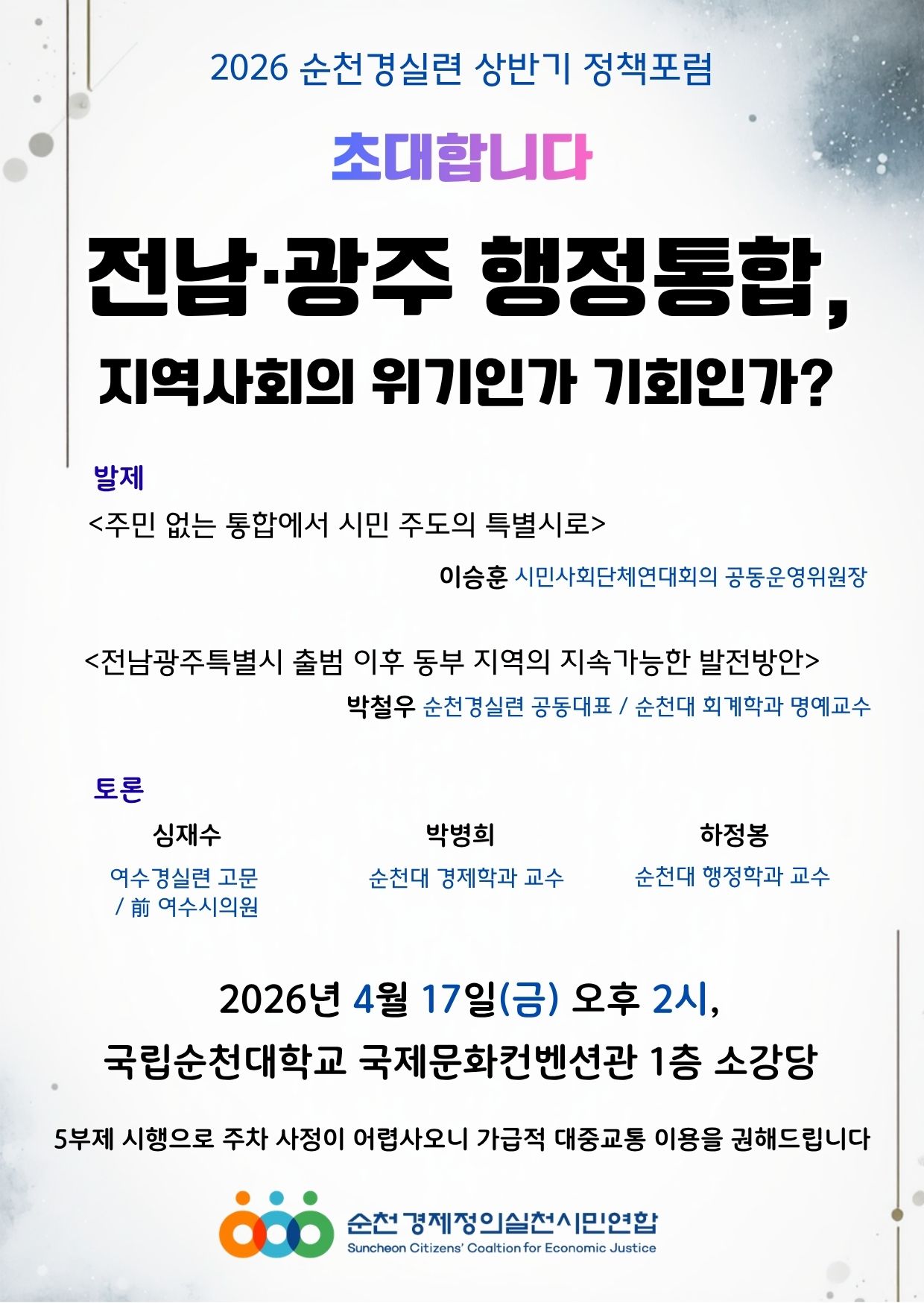 2026 ¼øÃµ°æ½Ç·Ã »ó¹Ý±â Á¤Ã¥Æ÷·³ <Àü³²¡¤±¤ÁÖ ÇàÁ¤ÅëÇÕ, Áö¿ª»çȸÀÇ À§±âÀΰ¡ ±âȸÀΰ¡?>